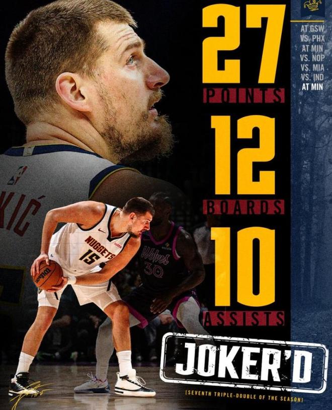 本场比赛是约基奇开季至今第7场交出三双,而本赛季仅打了12场比赛。