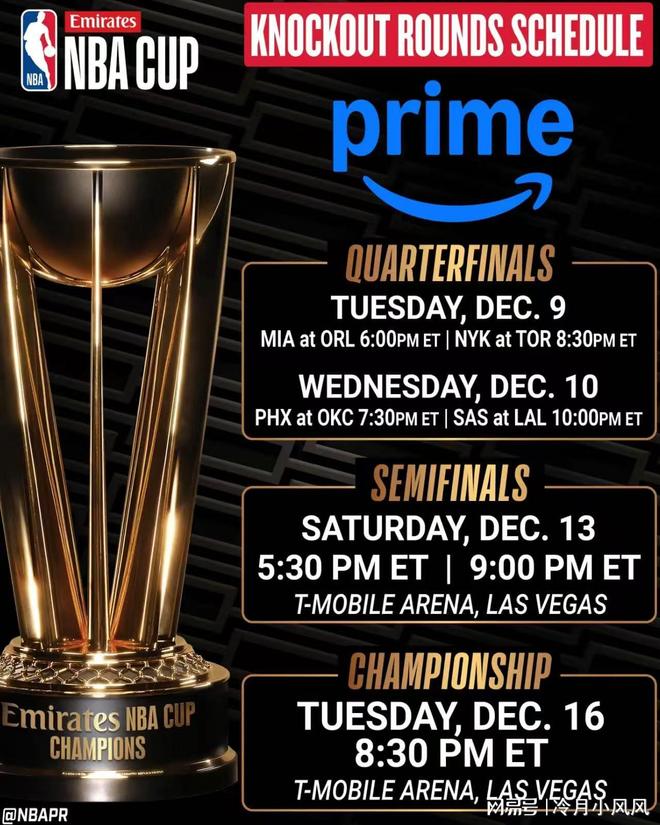 今日,NBA官方公布了NBA杯(原季中锦标赛)的淘汰赛赛程,具体安排情况为(均为北京时间):
