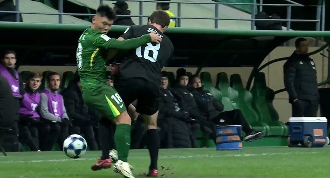 再度落后,北京国安也积极展开进攻,无奈组织混乱很难打穿对手防线。临近比赛结束之前,北京国安球员一次解围时被对手撞倒(下图),于是双方球员爆发了冲突。这次冲突,对手有球员被推倒。