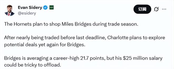 北京时间12月3日,据名记Sidery报道,黄蜂队计划在交易窗口期兜售迈尔斯-布里奇斯。早在上赛季的交易截止日前,布里奇斯就险些被送走,如今,黄蜂方面打算再次为其探寻潜在交易。本赛季至今,布里奇斯场均能砍下生涯新高的21.7分。Sidery表示,布里奇斯2500万美元的年薪,可能会成为交易达成的一大阻碍。