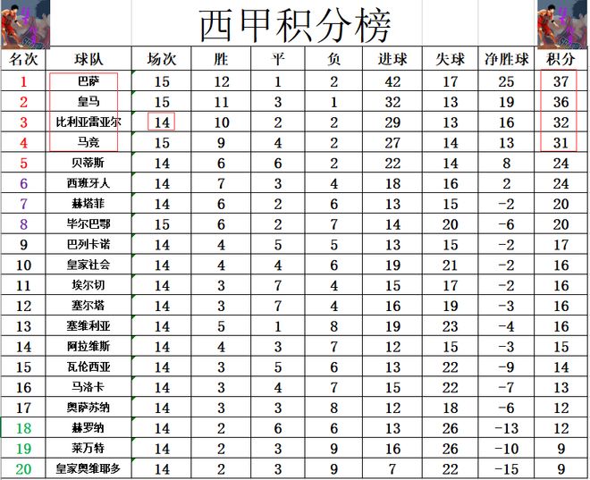 积分榜方面,皇马连续踢4个客场,今天大胜毕尔巴鄂竞技止住3连平颓势,这样的话他们就还是落后巴萨1分位列第2。比利亚雷亚尔少赛一场,落后皇马4分仍然排在第3,马竞昨天输给巴萨,他们就被拉开了分差,已经落后皇马5分,少巴萨6分。